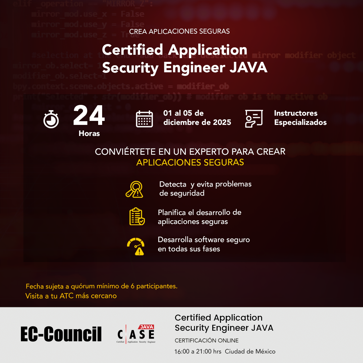 Con la certificación Certified Application Security Engineer (CASE) JAVA™ de EC-Council®, te ofrece una formación 100% práctica, donde dominarás todo el ciclo de vida del desarrollo de software (SDLC) con un enfoque en la seguridad real, no solo teoría. Aprenderás a proteger tus aplicaciones desde la raíz, identificando y mitigando vulnerabilidades antes de que se conviertan en amenazas. Con esta certificación, obtendrás un skillset de élite que te colocará por encima del promedio en el mercado laboral global, impulsando tu perfil profesional hacia nuevos niveles.Porque te ofrece una formación 100% práctica, donde dominarás todo el ciclo de vida del desarrollo de software (SDLC) con un enfoque en la seguridad real, no solo teoría. Aprenderás a proteger tus aplicaciones desde la raíz, identificando y mitigando vulnerabilidades antes de que se conviertan en amenazas. Con esta certificación, obtendrás un skillset de élite que te colocará por encima del promedio en el mercado laboral global, impulsando tu perfil profesional hacia nuevos niveles.