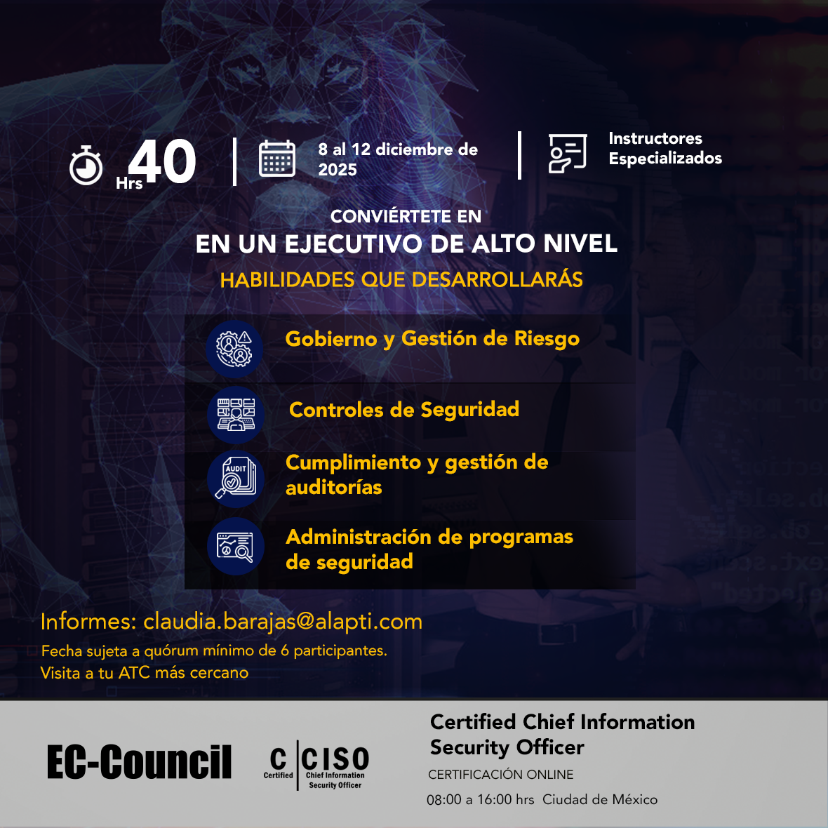 El CCISO (Certified Chief Information Security Officer) de EC-Council es una certificación diseñada para líderes y ejecutivos que gestionan la estrategia de seguridad de la información en una organización. Abarca áreas clave como gobernanza, gestión de riesgos, controles de seguridad, auditorías, programas de cumplimiento y liderazgo corporativo. Su objetivo es desarrollar una visión estratégica y directiva de la ciberseguridad, preparando a los profesionales para ocupar roles de CISO, CIO o Director de Seguridad, capaces de alinear la protección de la información con los objetivos del negocio.