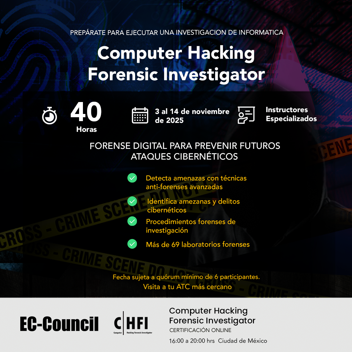 El CHFI (Computer Hacking Forensic Investigator) de EC-Council es una certificación especializada que forma a los profesionales en el análisis y la investigación forense digital. Su objetivo es enseñar a identificar, recolectar, preservar, analizar y presentar evidencia electrónica de manera que sea válida ante procesos legales. A lo largo del programa, los participantes aprenden a investigar ciberataques, recuperar datos eliminados, analizar sistemas comprometidos y descubrir rastros de actividades maliciosas en computadoras, redes, dispositivos móviles y entornos en la nube. Reconocido internacionalmente, el CHFI valida las competencias necesarias para enfrentar incidentes de ciberseguridad con rigor técnico y metodológico, convirtiéndose en una credencial clave para especialistas en seguridad, investigadores forenses y personal de respuesta a incidentes.