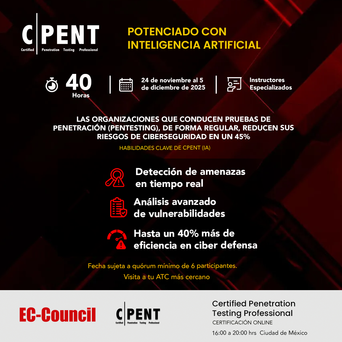 CPENT IA le permite dominar el pentesting dentro de un entorno de red empresarial evaluando riesgos de intrusión y realizando informes estructurados y procesables. Distíngase con CPENT IA aprendiendo más allá del conocimiento técnico (delimitando compromisos, entendiendo el diseño, estimando el esfuerzo y presentando hallazgos) y prospere como líder en ciberseguridad ofensiva con habilidades en IA que ningún otro entrenamiento de pentesting le ofrece.
